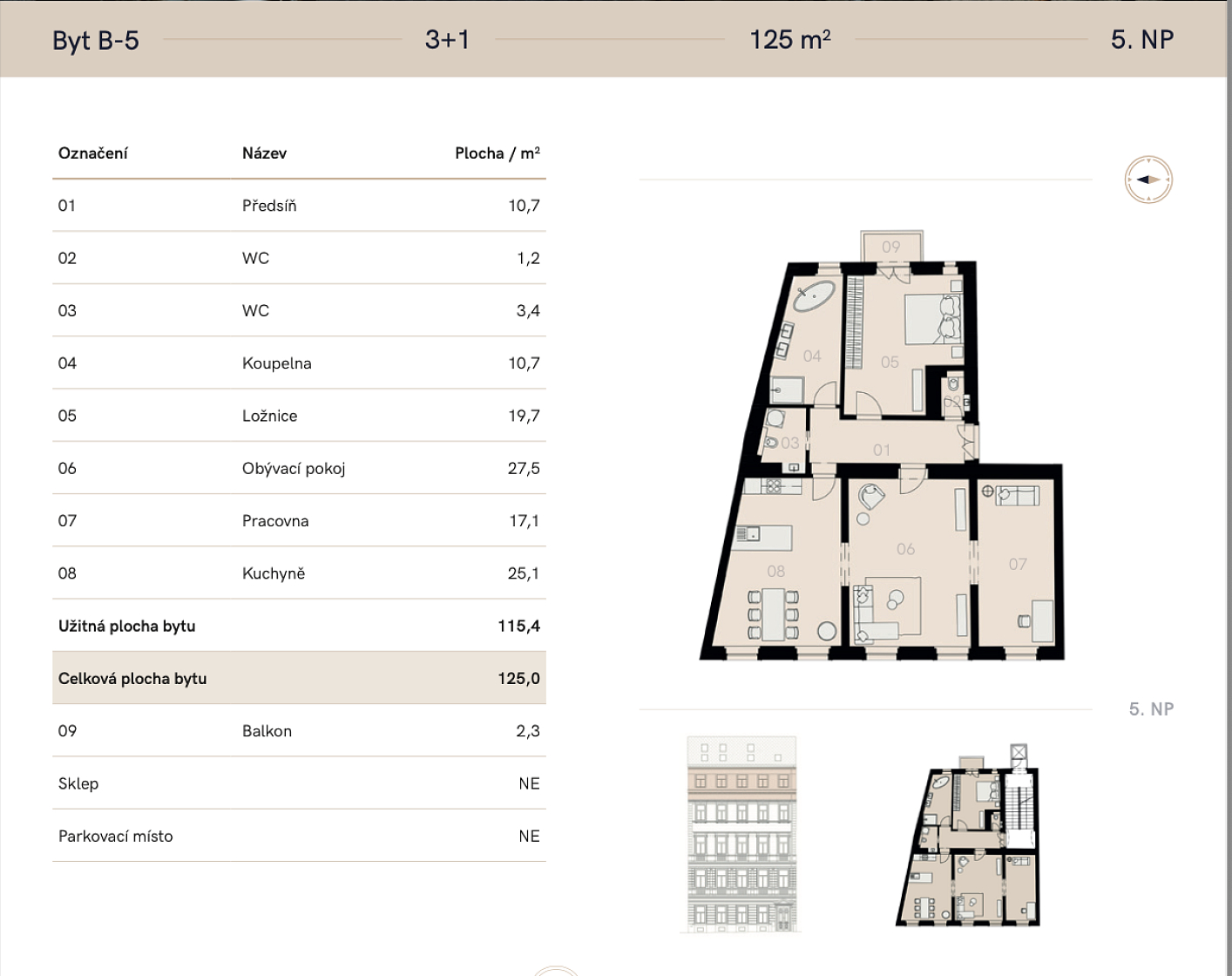 Podlahová plocha 125 m2, balkón 2,3 m2.