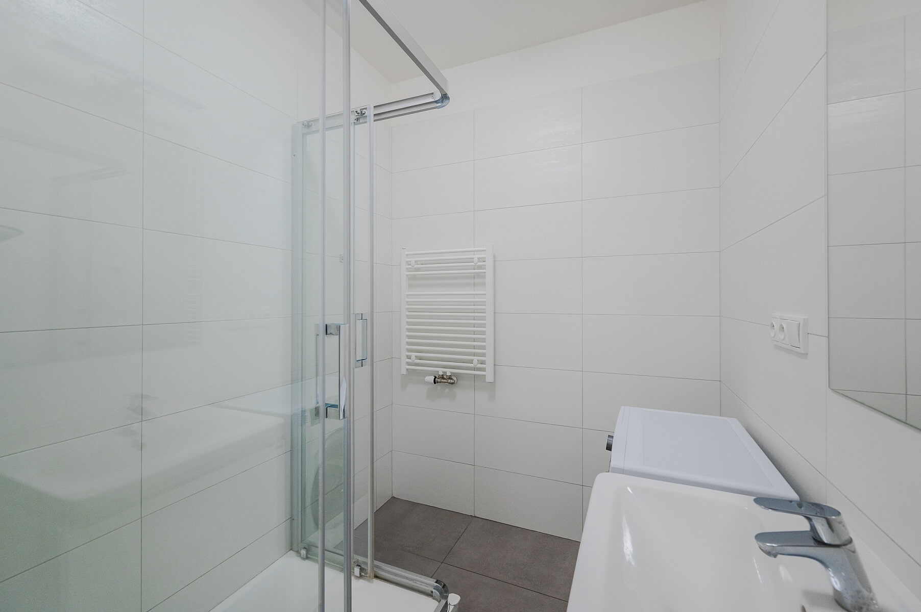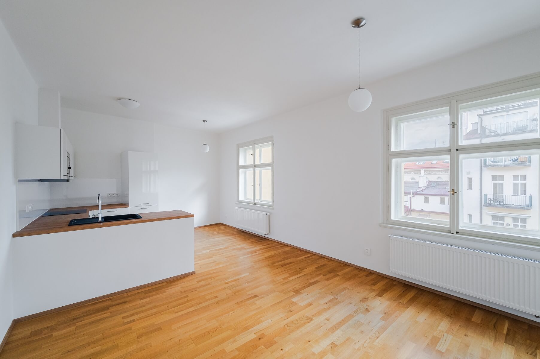 Zrekonstruovaný dvoupokojový byt je součástí rezidenčního projektu umístěného v cihlovém domě z počátku 20. století, který stojí v pěkné uličce magické Petrské čtvrti na Novém Městě blízko vltavského nábřeží, parku Lannova a Těšnov, ostrova Štvanice a přestupní stanice MHD Florenc.