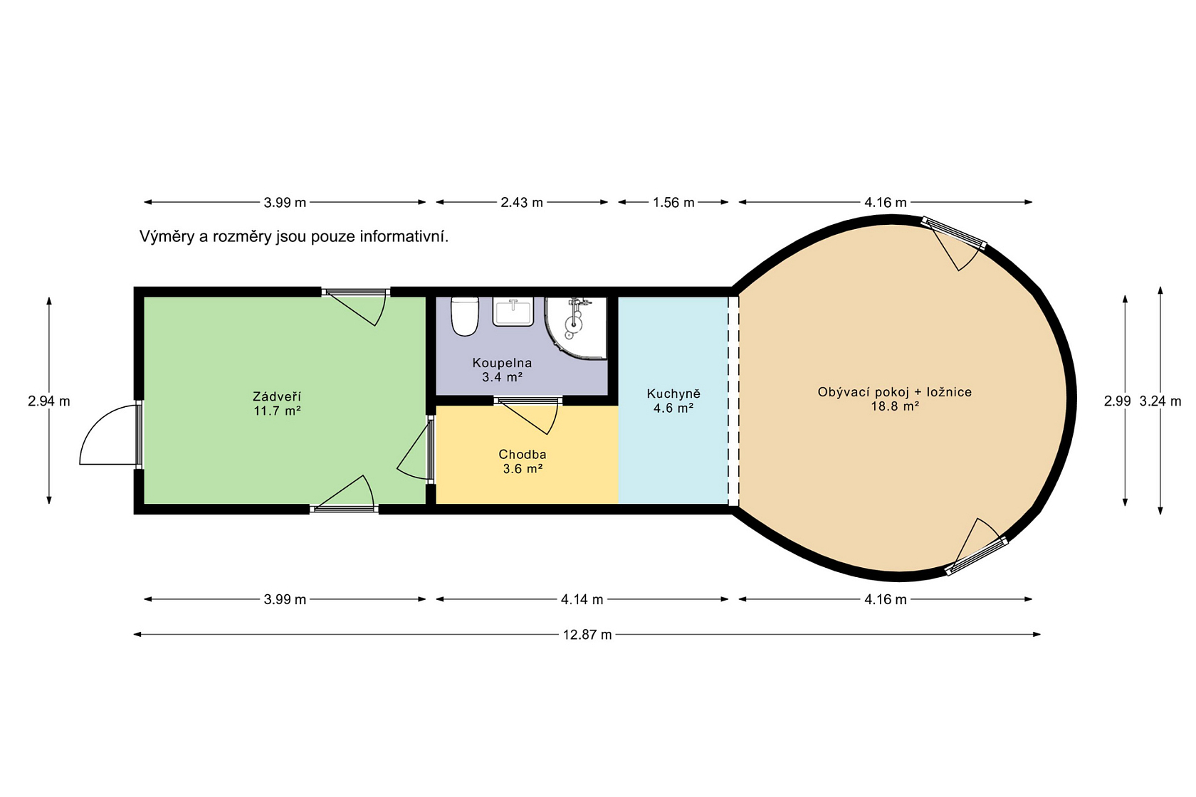 Plochu bytu umístěného v přízemí domu tvoří kruhový pokoj s kuchyňkou, koupelna (sprchový kout, umyvadlo, WC) a předsíň. Jednotka je vhodná i jako kancelář.