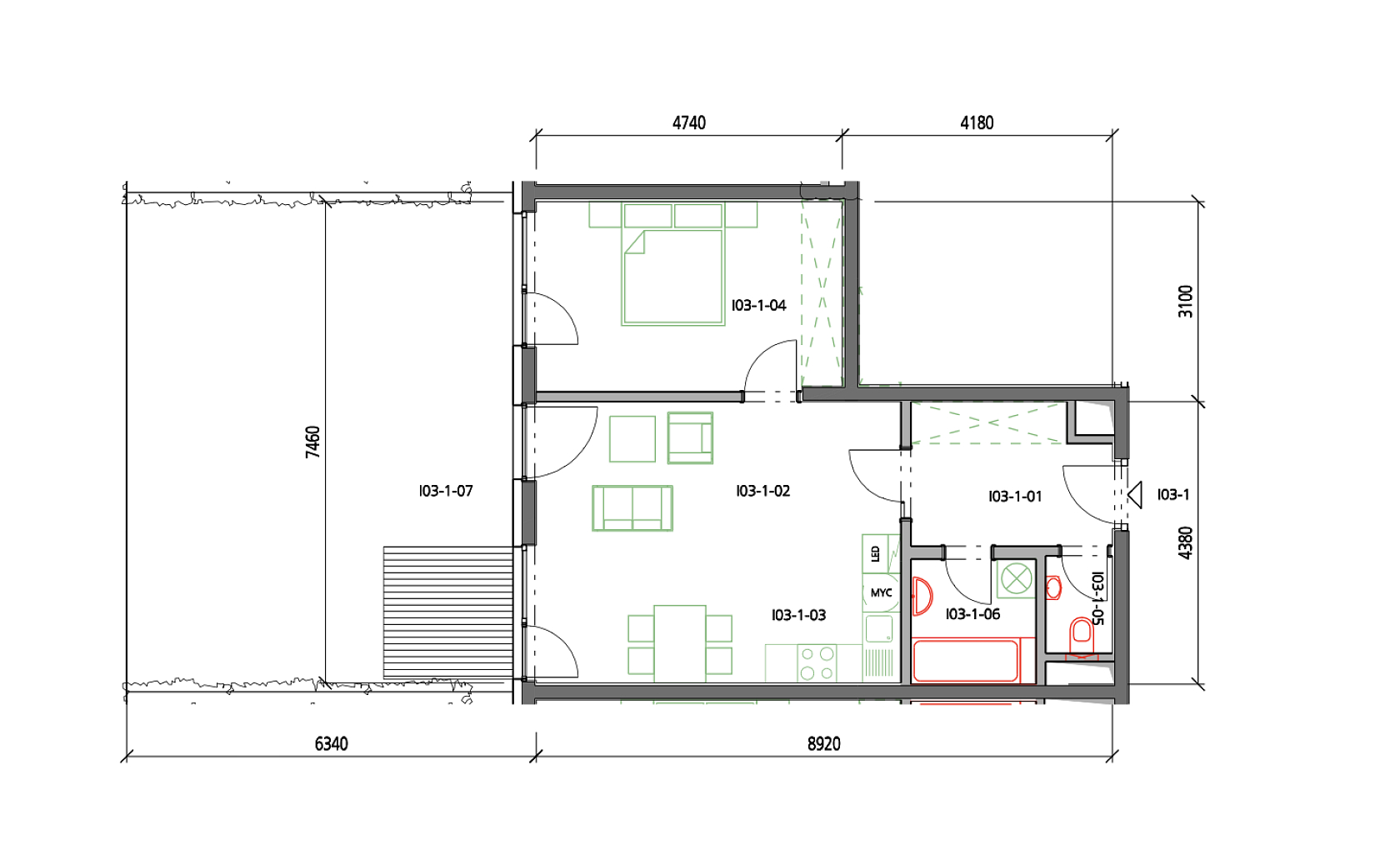 Celý byt je orientovaný do přezahrádky, dispozici tvoří obývací pokoj s kuchyňským koutem, 1 ložnice, koupelna (s vanou), samostatná toaleta a předsíň. Z obývacího pokoje vede vstup na dřevěnou zahradní terasu, přístup na předzahrádku má i ložnice.