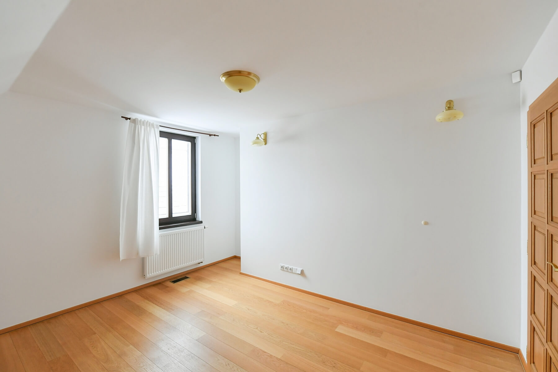 Přístup k bytu vede přes společnou vstupní halu v přízemí, v níž se pro obě jednotky nacházejí úložné prostory a technické místnosti. Z vlastní předsíně se vstupuje do koupelny a také do hlavní obytné části, kterou tvoří západně orientovaný obývací pokoj s krbem a přímým vstupem na terasu. Obývací prostor je částečně oddělený masivním schodištěm vedoucím do patra od jídelny s kuchyňským koutem, která má vstup na druhou terasu. Kuchyňská linka značky Scavolini je vybavena spotřebiči AEG, varnou deskou Miele a vinotékou Liebherr. V horním podlaží jsou umístěny tři ložnice, hlavní koupelna s vířivou vanou, sprchovým koutem Hüppe, toaletou a bidetem a dále druhá koupelna se sprchovým koutem Hüppe a toaletou. Součástí bytu je také zateplená a částečně pochozí půda o výměře 70 m², která nabízí možnost půdní vestavby. K bytu náleží samostatná garáž dimenzovaná pro 1 auto s elektricky ovládanými vraty.