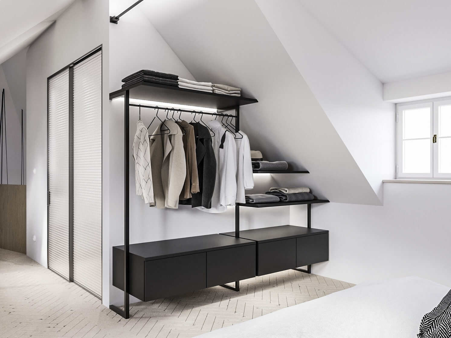 Bytová jednotka se nabízí k prodeji ve stavu white walls, dispozici je tak možné přizpůsobit individuálním potřebám budoucích majitelů. Architektonické řešení navrhuje umístit koupelnu a chodbu ve vstupním, 1. podlaží a hlavní obytnou zónu sestávající z obývacího pokoje, jídelní části a otevřené kuchyně spolu s koupelnou ve 2. podlaží. Horní část mezonetu mohou tvořit tři ložnice.