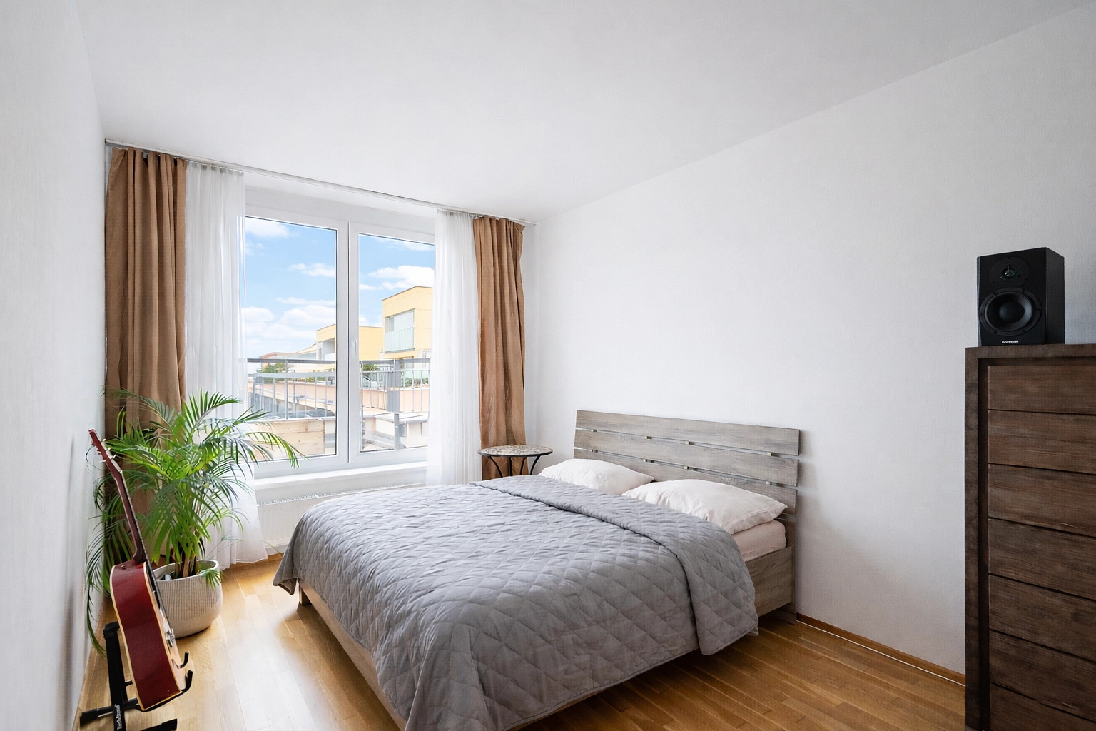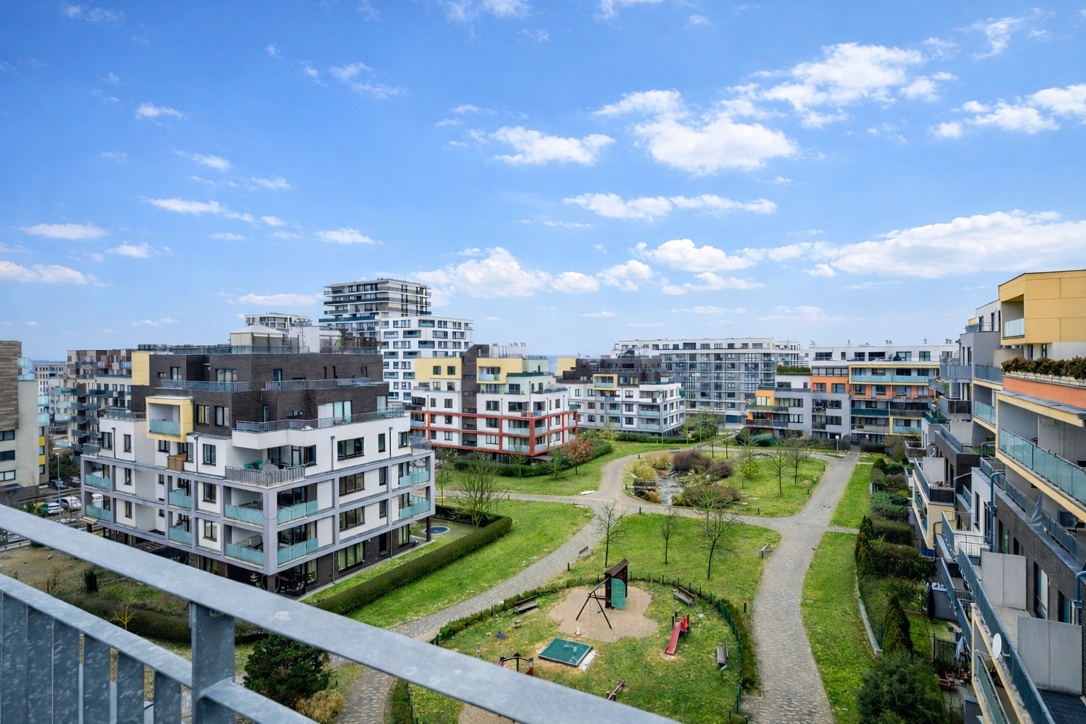 Světlý byt s velkou západní terasou, garážovým stáním a bezbariérovým přístupem je součástí moderního bytového domu stojícího v Britské čtvrti v Praze 13 – Stodůlkách v těsné blízkosti stanice metra.