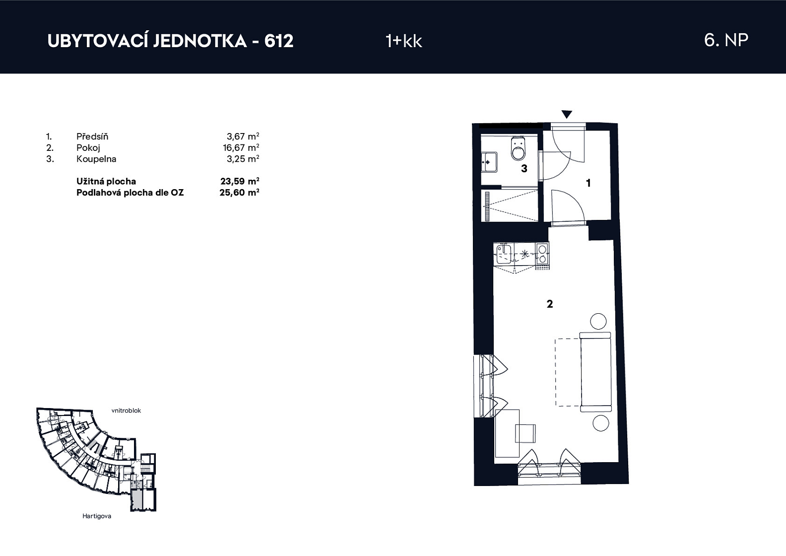 Ubytovací jednotka 1+kk, 6.NP, č. 612