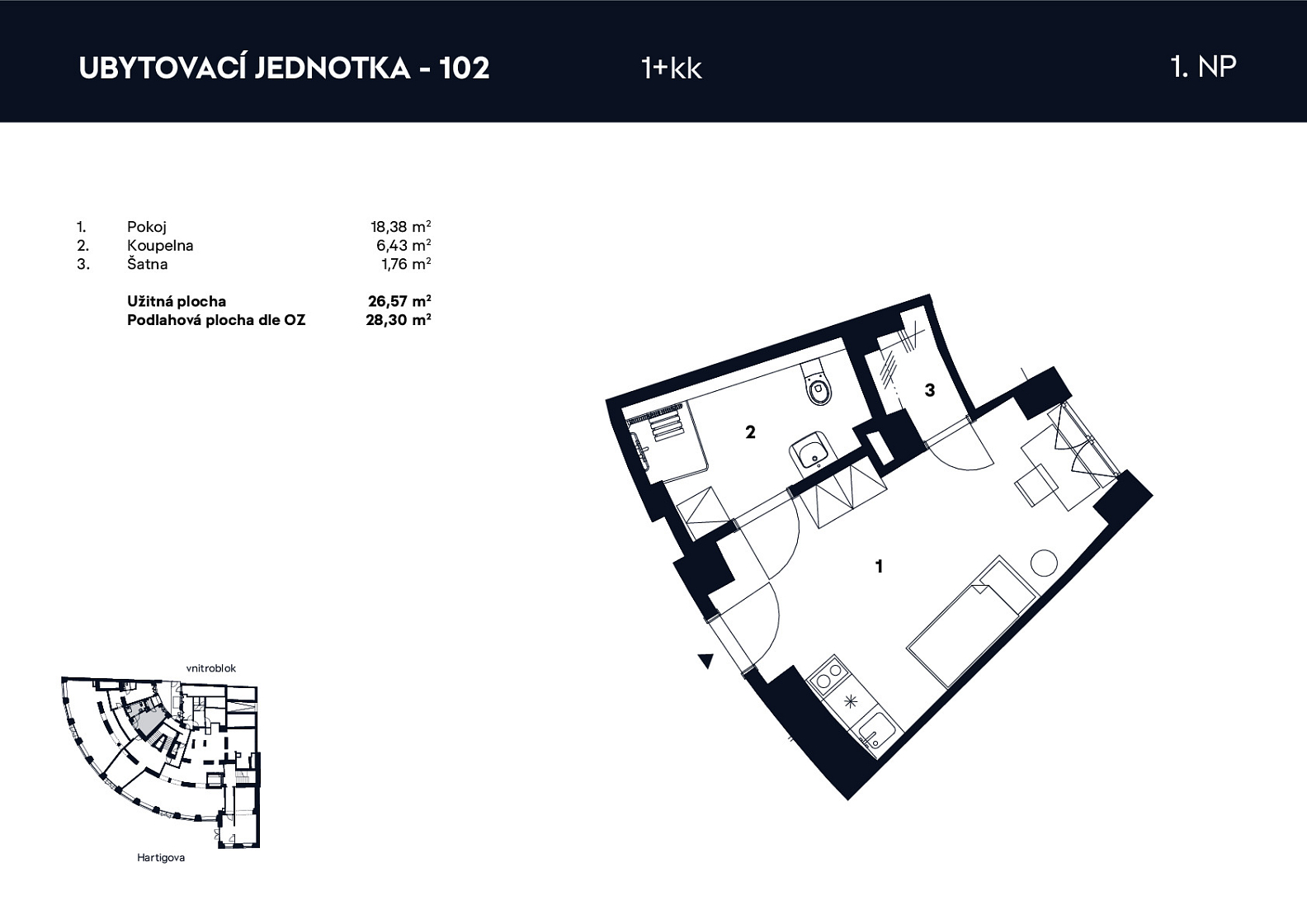 Ubytovací jednotka 1+kk, přízemí, č. 102