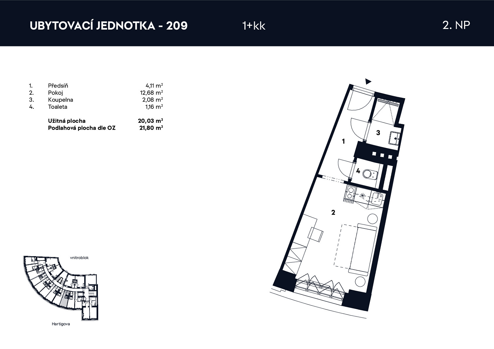 Ubytovací jednotka 1+kk, 2.NP, č. 209