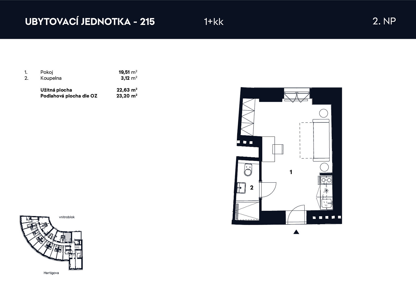 Ubytovací jednotka 1+kk, 2.NP, č. 214