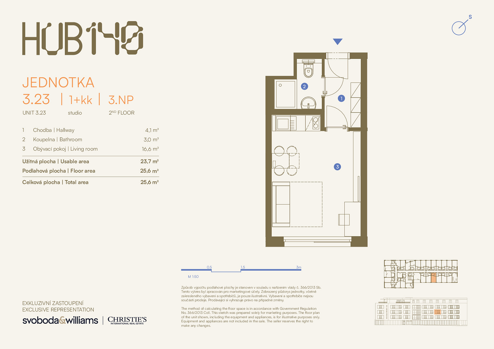 Přehlednou dispozici jednotky ve 3. podlaží tvoří obytná místnost s kuchyňským koutem, koupelna (se sprchovým koutem a WC) a předsíň.