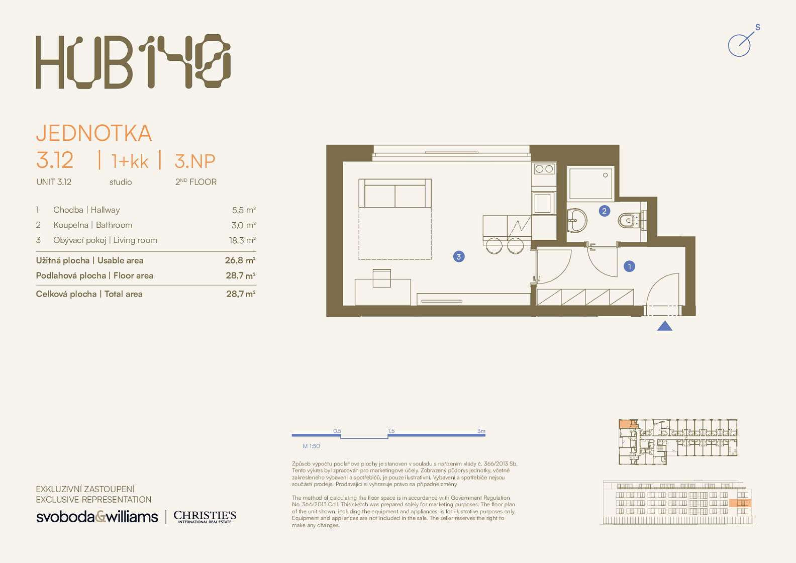 Přehlednou dispozici jednotky ve 3. podlaží tvoří obytná místnost s kuchyňským koutem, koupelna (se sprchovým koutem a WC) a vstupní chodba.