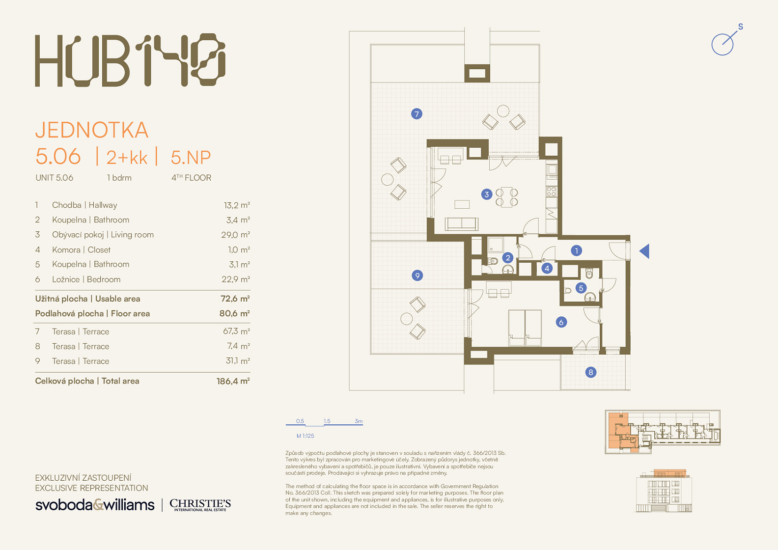 Podlahová plocha 80,6 m2, terasy 67,3 m2+7,4 m2+ 31,3 m2.