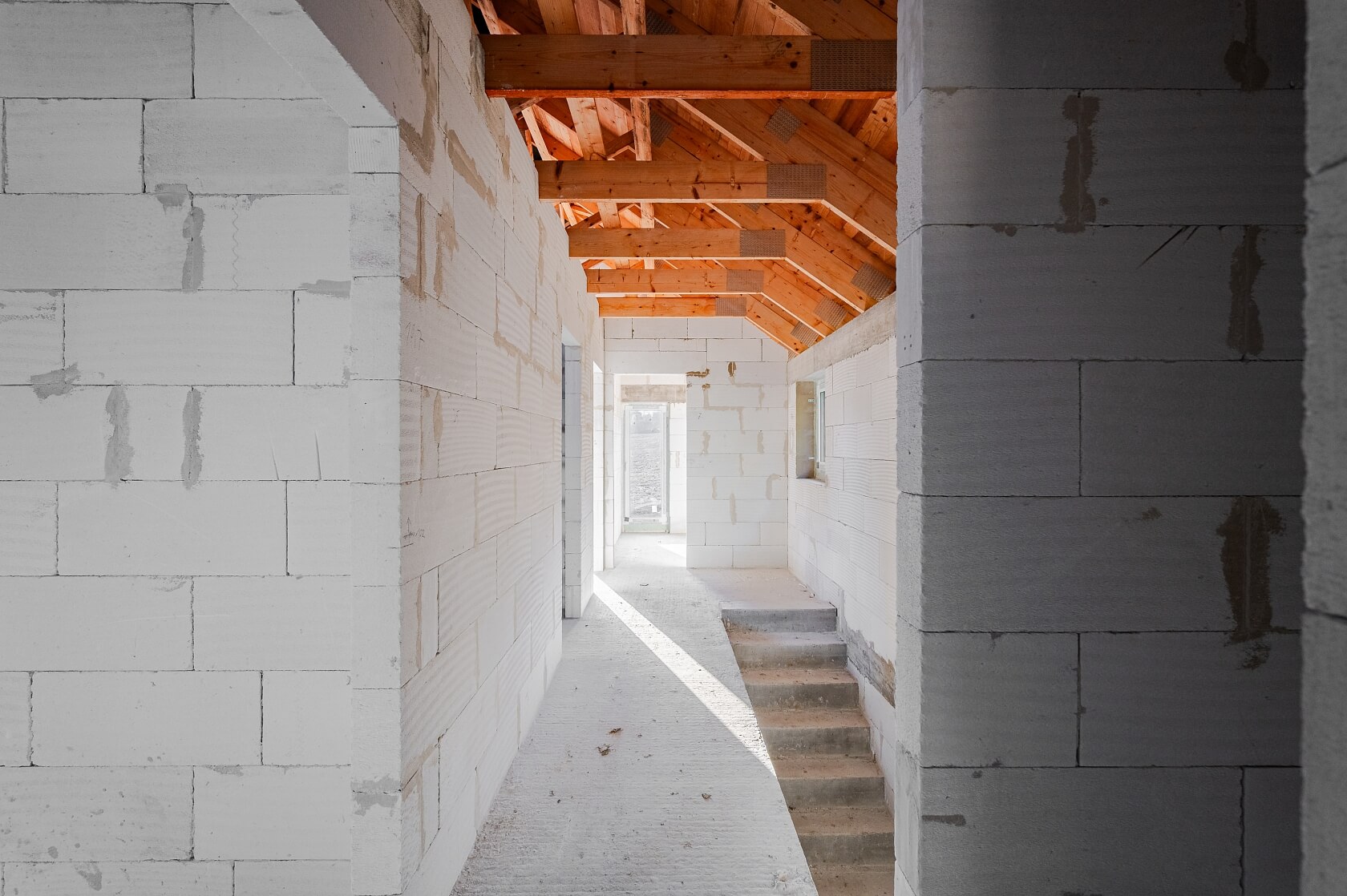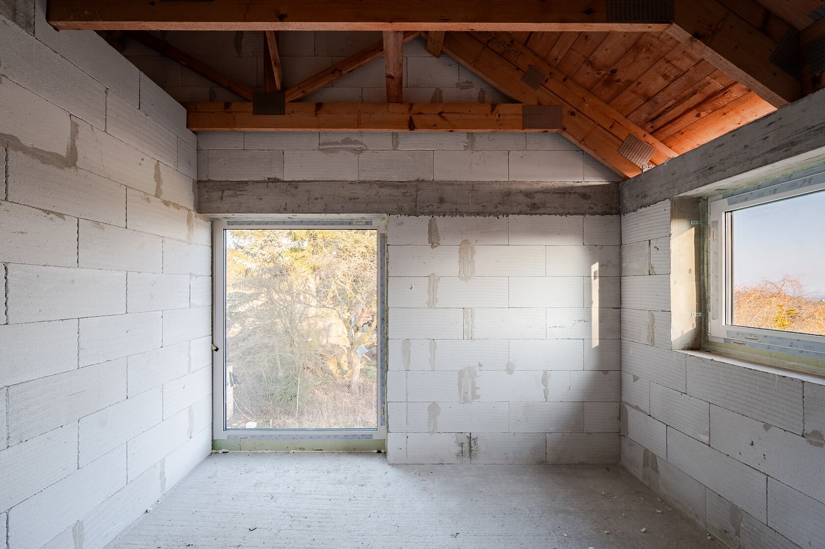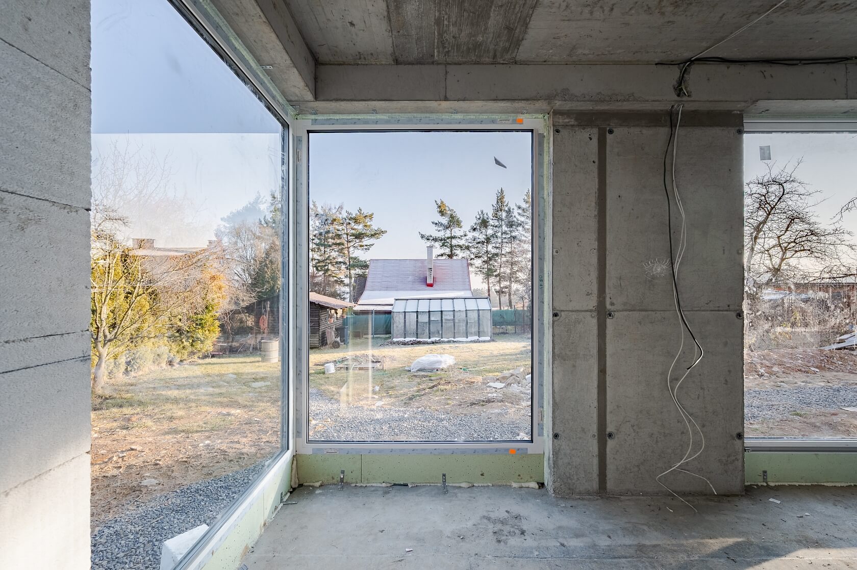Dům je zděný z cihel Ytong, skládaná keramická střešní krytina v černé barvě je značky Tondach. Spoustu denního světla i pěkné výhledy do okolí zajišťují velkoformátová okna s šedými plastovými rámy. Na pozemek je zavedena elektřina, zdrojem pitné vody je vrtaná studna, odpad bude řešen jímkou, případně domovní čističkou odpadních vod. Navržený způsob vytápění je elektrokotlem (případně tepelným čerpadlem), dům má i přípravu pro krbová kamna. Nemovitost se prodává v aktuální fázi hrubé stavby. Dle projektu se počítá se 2 parkovacími místy na pozemku, kde již stojí zahradní domek a skleník.