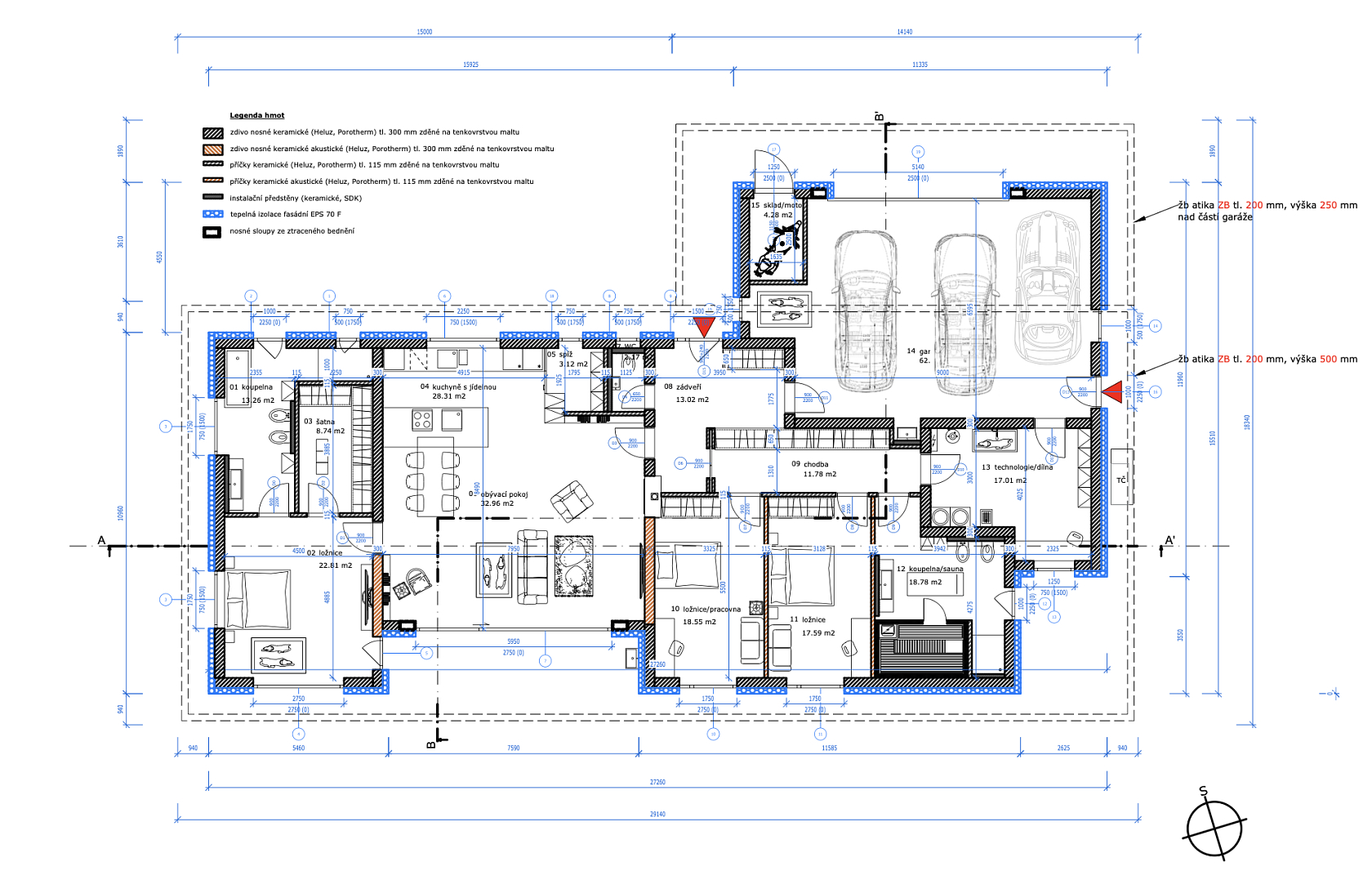 Dle platného stavebního povolení zde vznikne jednopodlažní rodinný dům s plochou střechou obsahující centrální obývací pokoj s otevřenou kuchyní, jídelnou a vstupem do jižně orientované zahrady, dále dispozici doplňuje hlavní ložnice s en-suite koupelnou a walk-in šatnou, 2 další ložnice, koupelna se saunou, samostatná toaleta, technická místnost, spíž, chodba a předsíň s přímým vstupem do dvojgaráže.