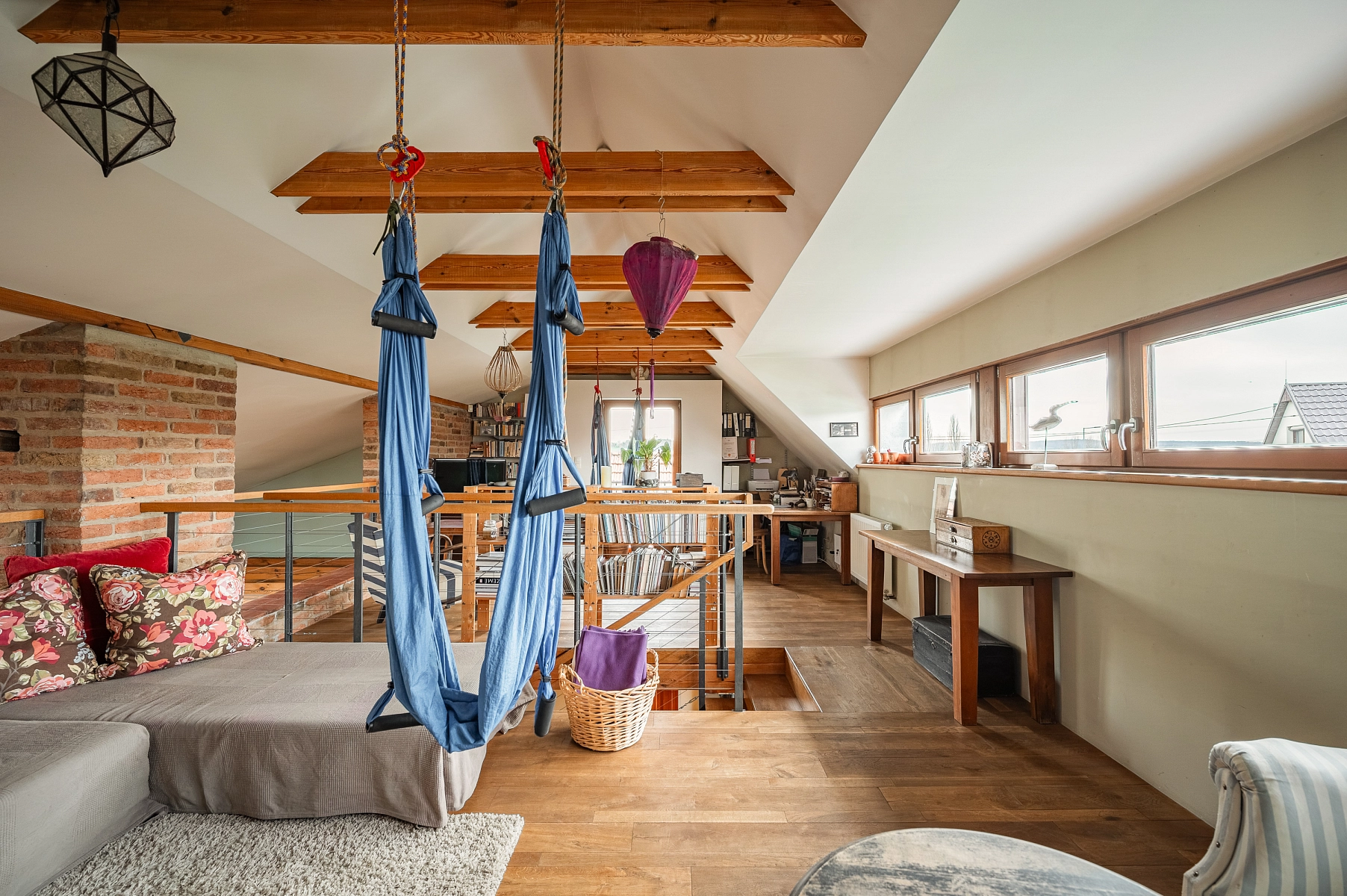 V přízemí domu se nachází hlavní obytná část, která je orientovaná na východ a do zahrady. Tvoří ji obývací pokoj se vstupem na krytou terasu propojený s jídelní částí a kuchyňským koutem se spíží. Tuto zónu zvýrazňují dvojité stropy a přiznané trámoví, jež dodává prostoru mimořádný charakter. Dále jsou zde 2 ložnice, koupelna s vanou a toaletou a technická místnost. Ze zádveří se otevírá vstup do haly, z níž se vchází do druhé koupelny se sprchovým koutem a toaletou, a také po schodišti do patra. V horním podlaží je situována třetí ložnice s velkou šatnou a prostorná otevřená galerie.