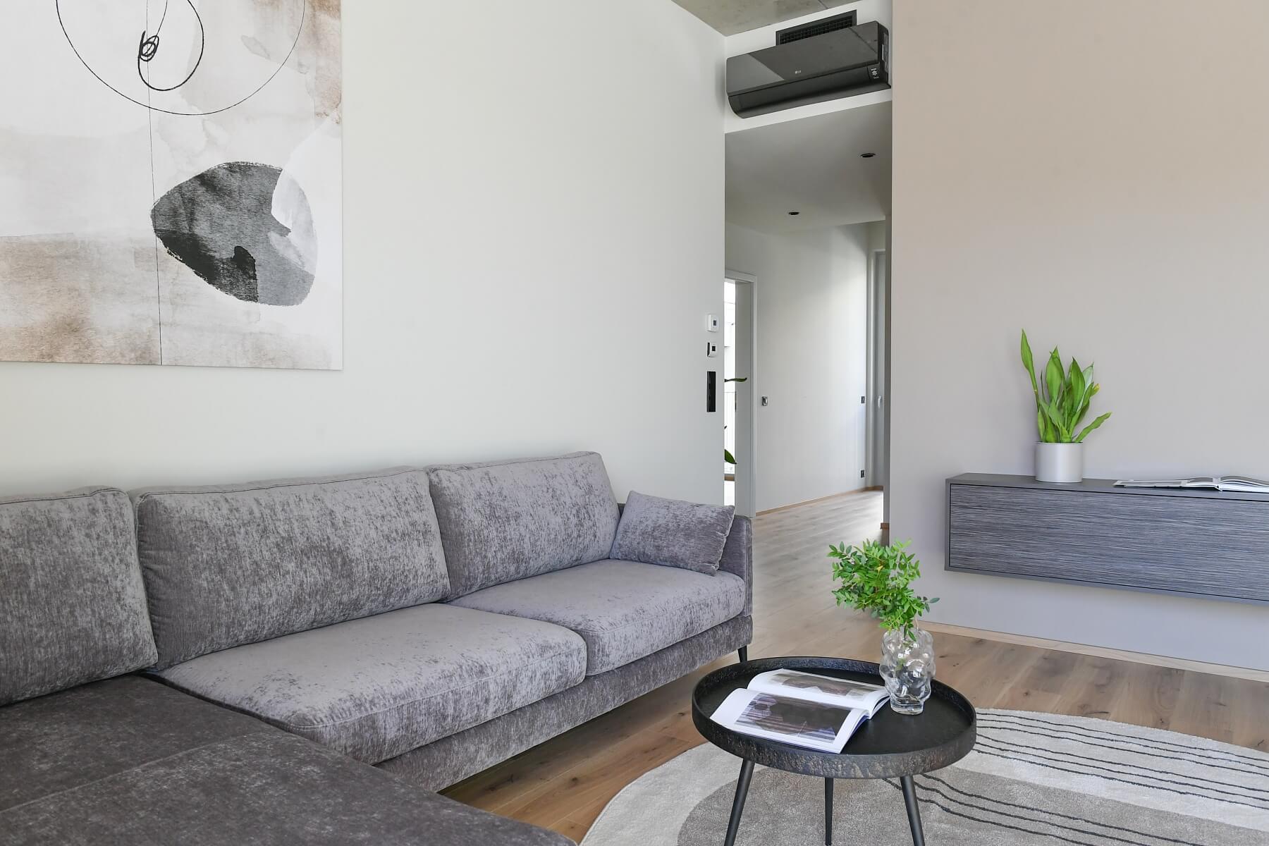 Klimatizace, řízené větrání, masivní dřevěné podlahy, velkoformátová dlažba, vestavěné úložné prostory, nábytek, svítidla a závěsy, předokenní rolety, centrální podlahové vytápění ve všech místnostech, pračka, sušička, myčka, indukční varná deska, videotelefon, kolárna v budově, nabíječka na elektromobily v garáži. Možnost pronájmu garážového stání a sklepa za dodatečný poplatek.