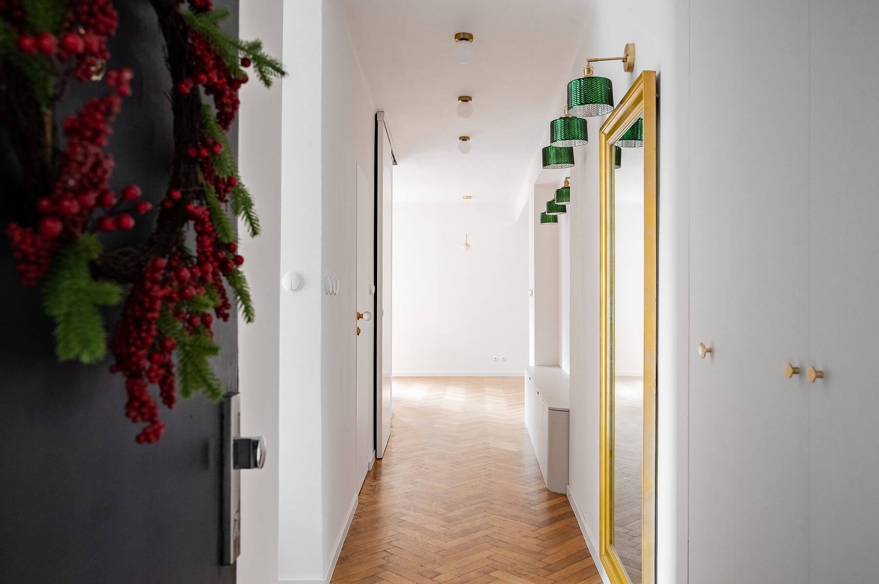 Interiér tvoří obývací pokoj s plně vybavenou kuchyní a přístupem do lodžie, ložnice s vestavěnou skříní a balkonem, ložnice pro hosty / pracovna, koupelna se sprchovým koutem, úložná / technická komora, samostatná toaleta s úložnými prostory a vstupní chodba s vestavěnými skříněmi.