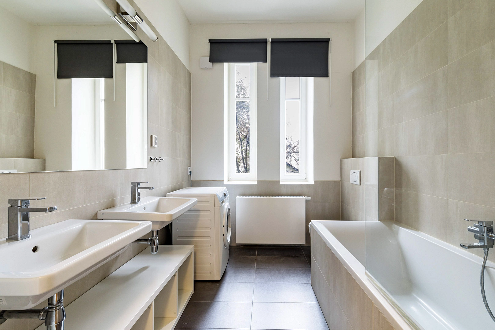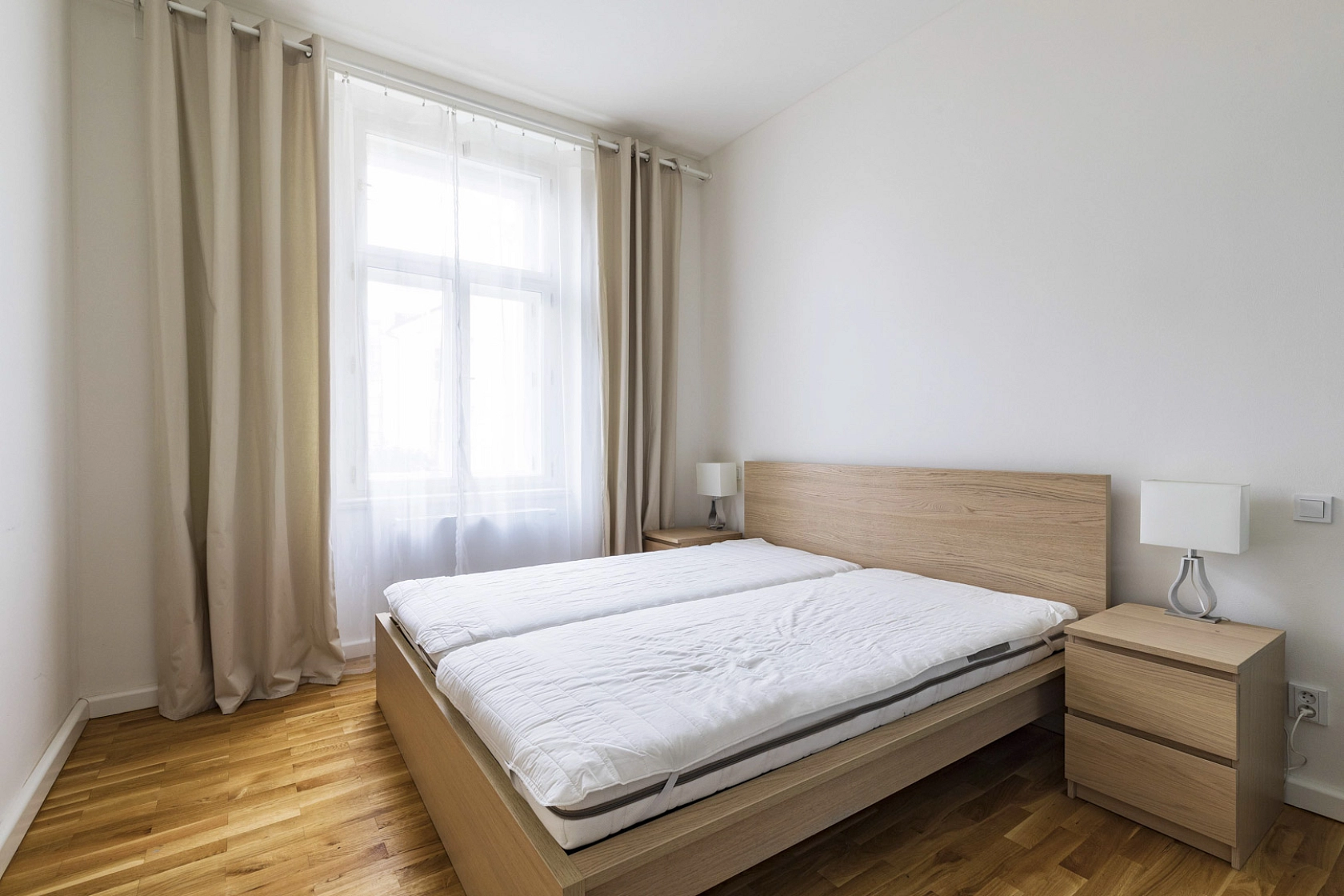 Interiér tvoří obývací pokoj s plně vybavenou kuchyní a jídelním prostorem, hlavní ložnice orientovaná do klidného vnitrobloku, 2. ložnice, koupelna s okny, vanou a toaletou a vstupní chodba.