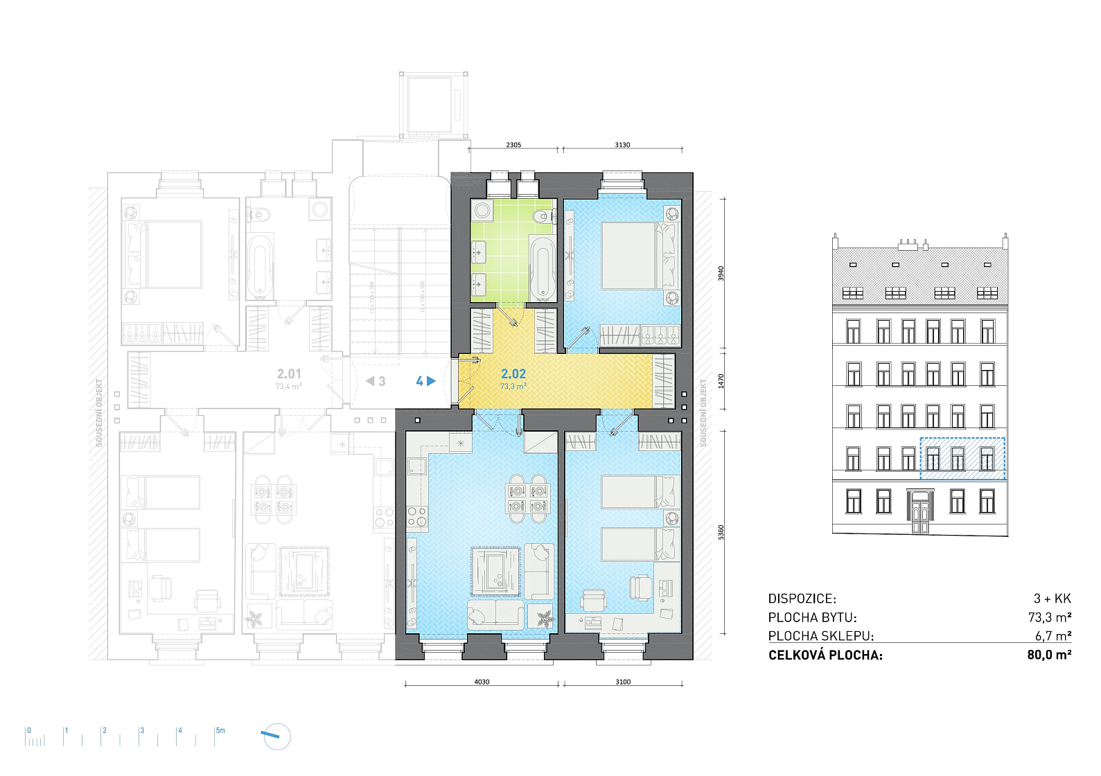 * Výměra jednotky dle občanského zákoníku. Plocha je tvořena součtem celé plochy jednotky a ohraničená obvodovými zdmi.