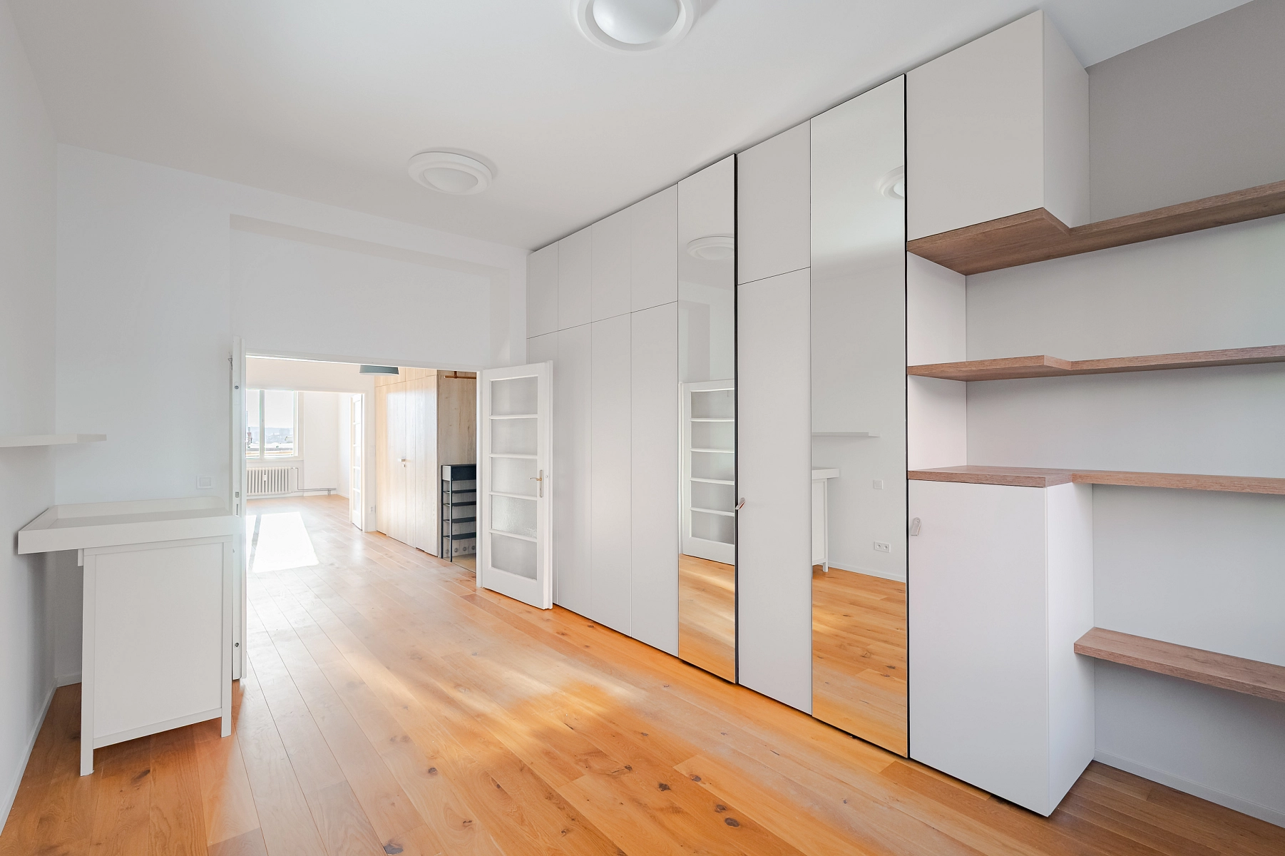 Zachované původní prvky, dubové podlahy, kvalitní vinyl, množství vestavěných úložných prostor, repasované dvoukřídlové interiérové dveře, centrální vytápění, pračka, sušička, myčka.