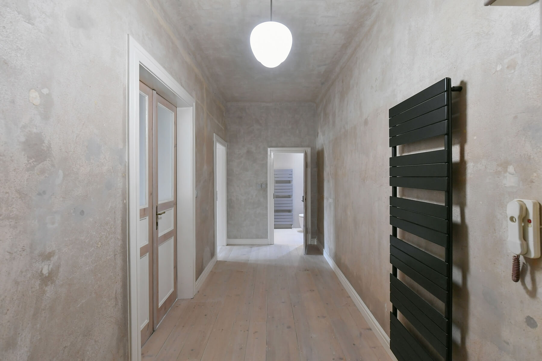 Interiér tvoří obývací pokoj s plně vybavenou kuchyní, dvě ložnice - jedna s původními kachlovými kamny, dále koupelna (vana, toaleta), úložná komora, techcnická komora s úložným prostorem a vstupní hala. Byt je orientován do ulice.