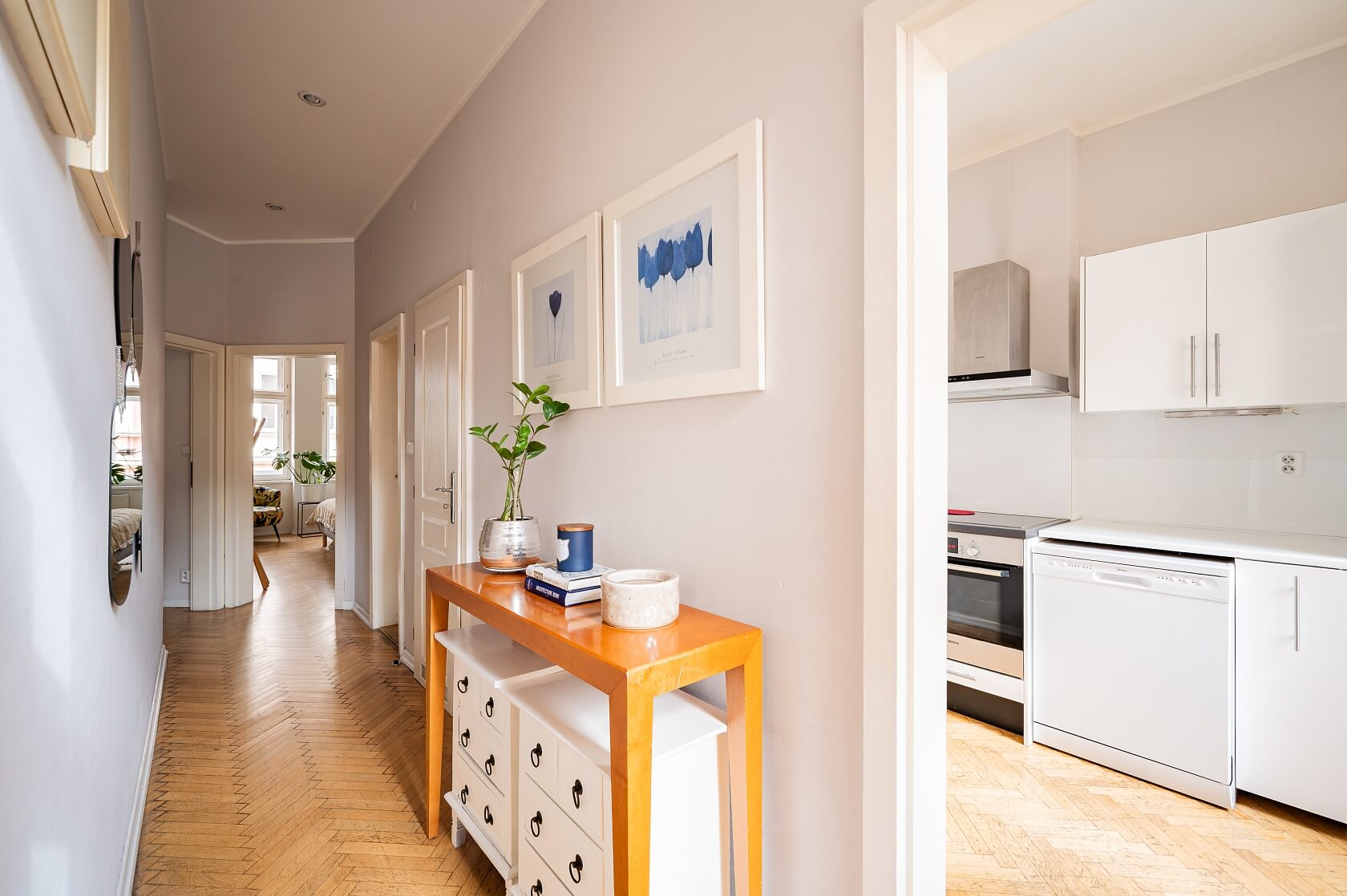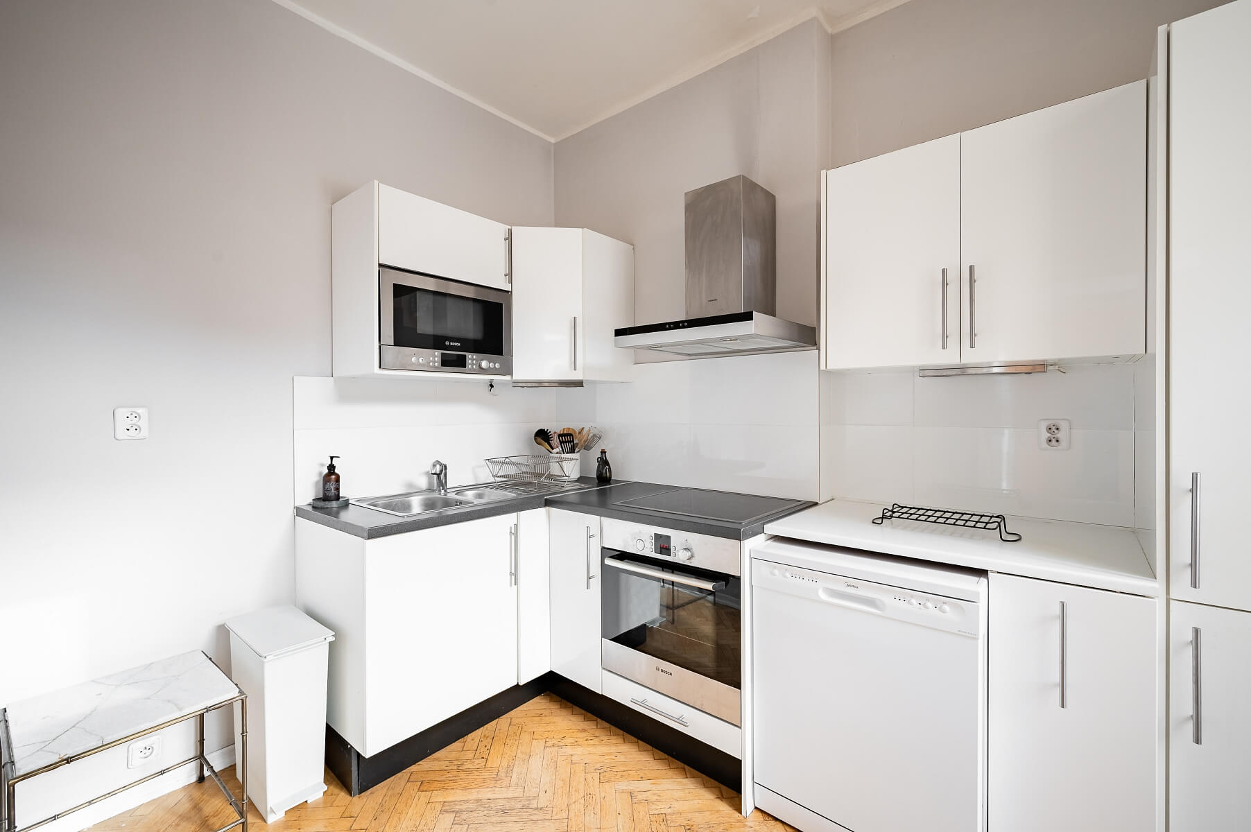 Dřevěné parkety, dlažba, plynový kotel, pračka, myčka, indukční varná deska, mikrovlnná trouba.