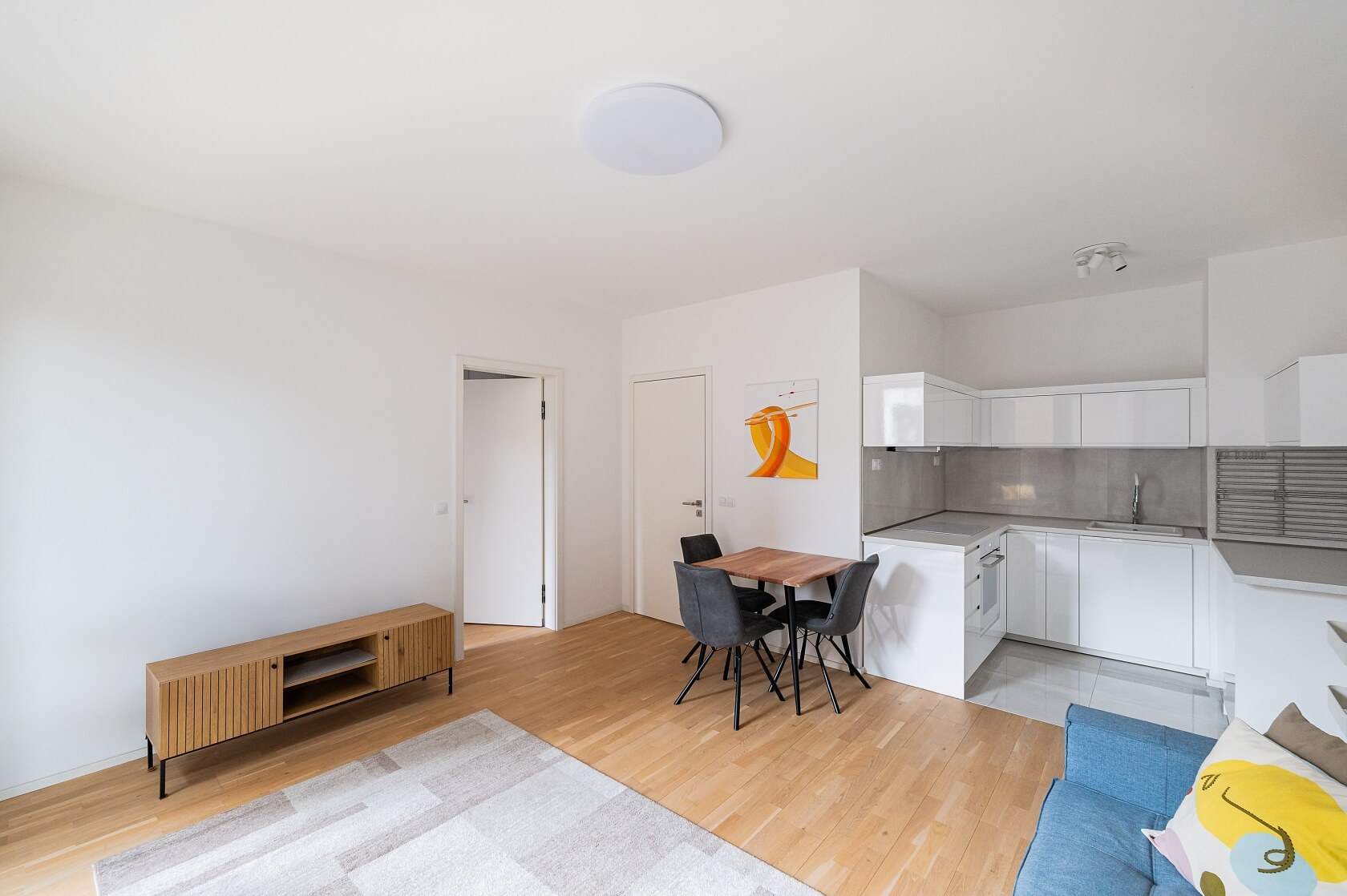Byt má obývací pokoj s plně vybavenou kuchyní a přístupem na terasu / předzahrádku, jednu ložnici, koupelnu se sprchovým koutem a toaletou a vstupní chodbu s vestavěnou skříní.