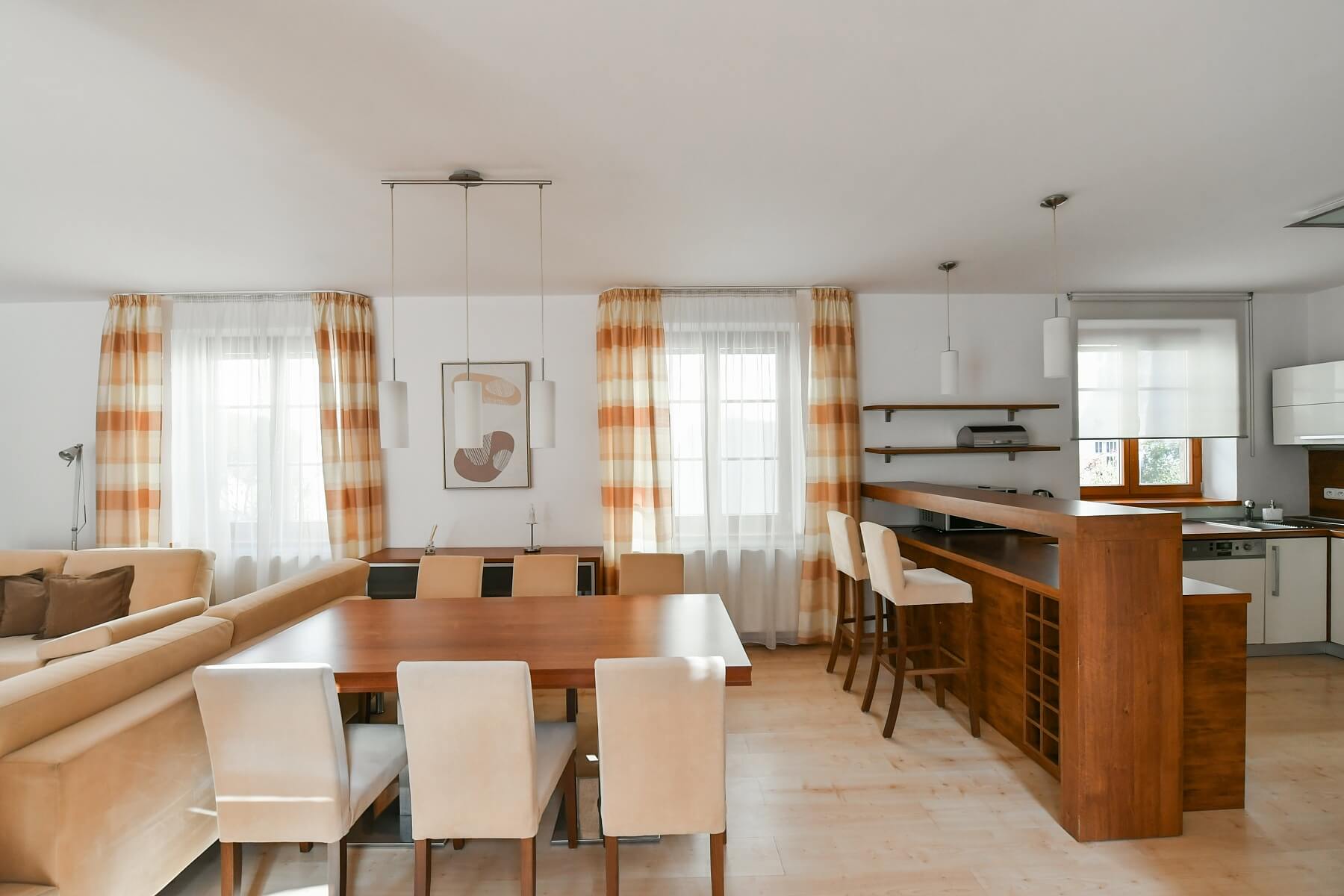 Byt má 2 ložnice a 2 koupelny a je vybaven vysoce kvalitním zařízením a materiály. Ve spodní úrovni se nachází obývací pokoj s plně vybavenou kuchyní, krbovými kamny a francouzskými okny s výhledem do vnitrobloku, dále koupelna se sprchovým koutem a toaletou, technická komora, vybavená šatna a vstupní chodba s vestavěnými skříněmi a úložnými prostory. V prvním patře je umístěna galerie s velkou terasou, hlavní ložnice, pracovna / ložnice pro hosty a koupelna se sprchovým koutem, rohovou masážní vanou a toaletou.