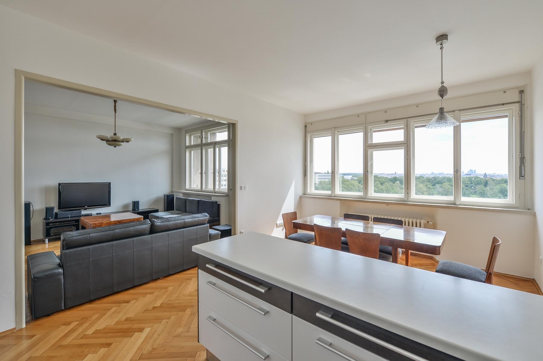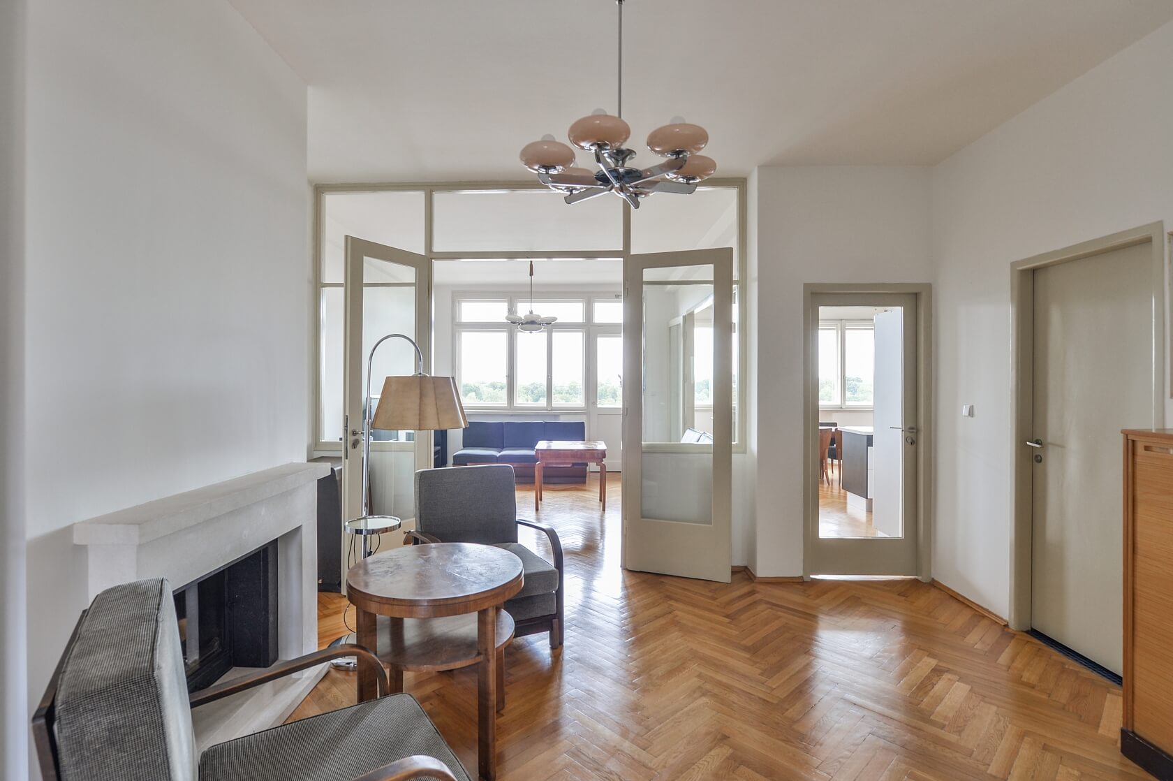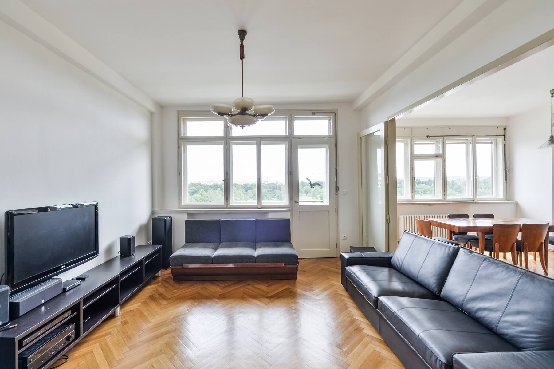 Klimatizovaný zařízený byt se 2 balkony, krbem a výhledem do přilehlých Letenských sadů, v 5. patře funkcionalistického činžovního domu s výtahem v Praze 7 – Bubenči, v pěším dosahu parku na Letné a Stromovky. Vyhledávaná rezidenční lokalita s bohatou občanskou vybaveností - kavárny, restaurace, bistra, obchody, kulturní zařízení ad., s velmi rychlou dostupností do centra, pouhou jednu zastávku tramvají od stanice metra Hradčanská. Rychlá dostupnost na letiště a do mezinárodních škol v Praze 6.