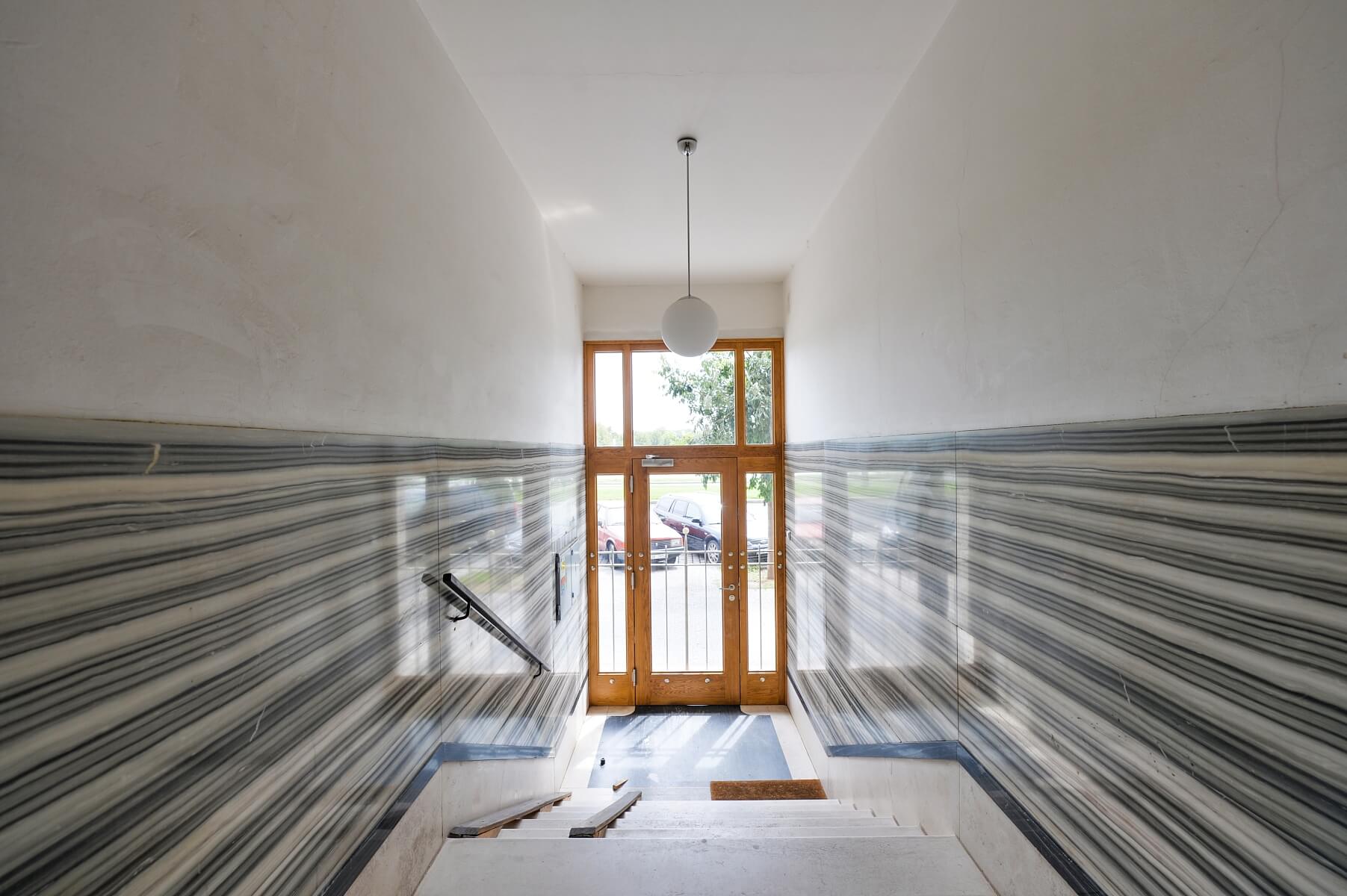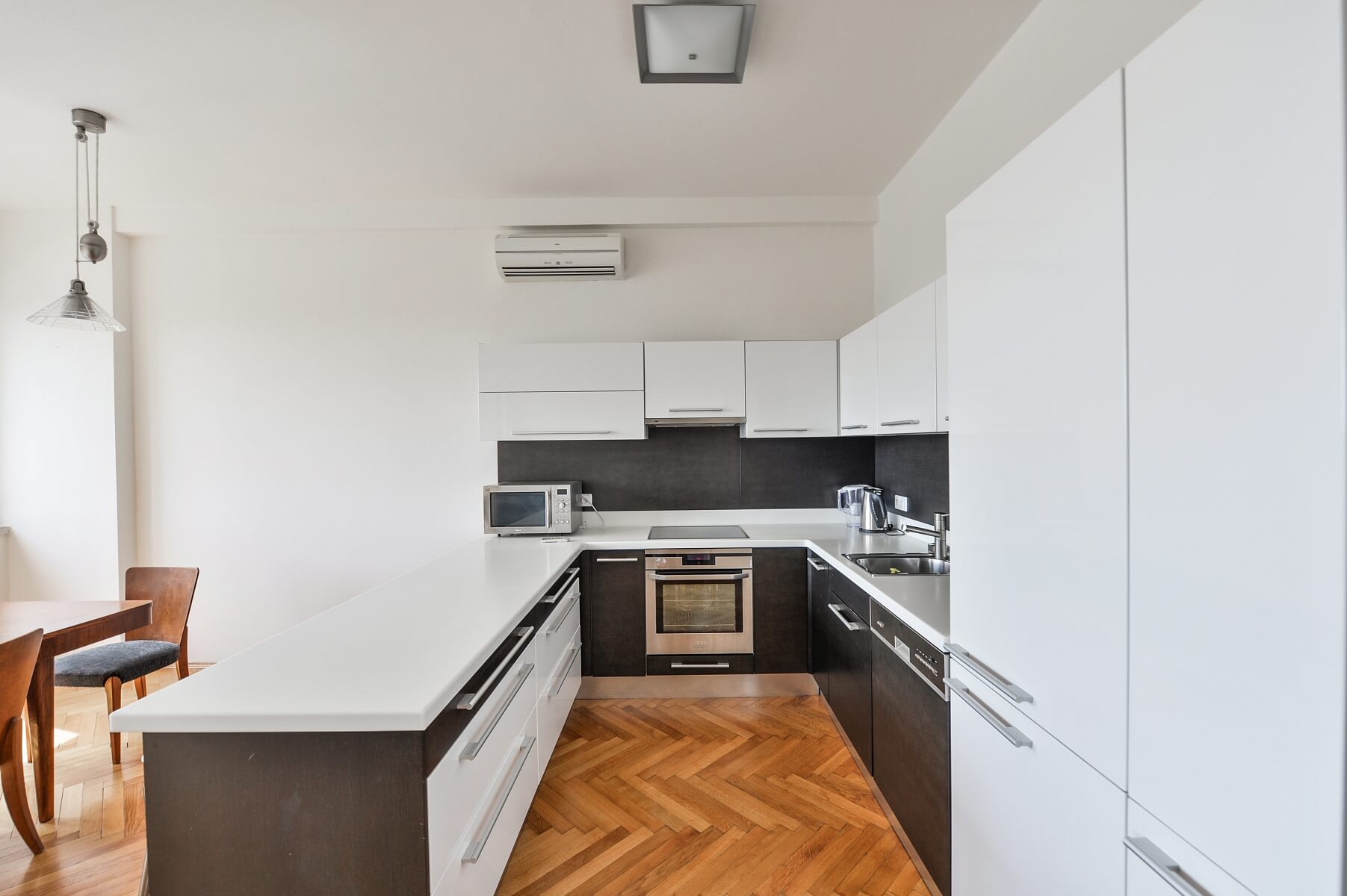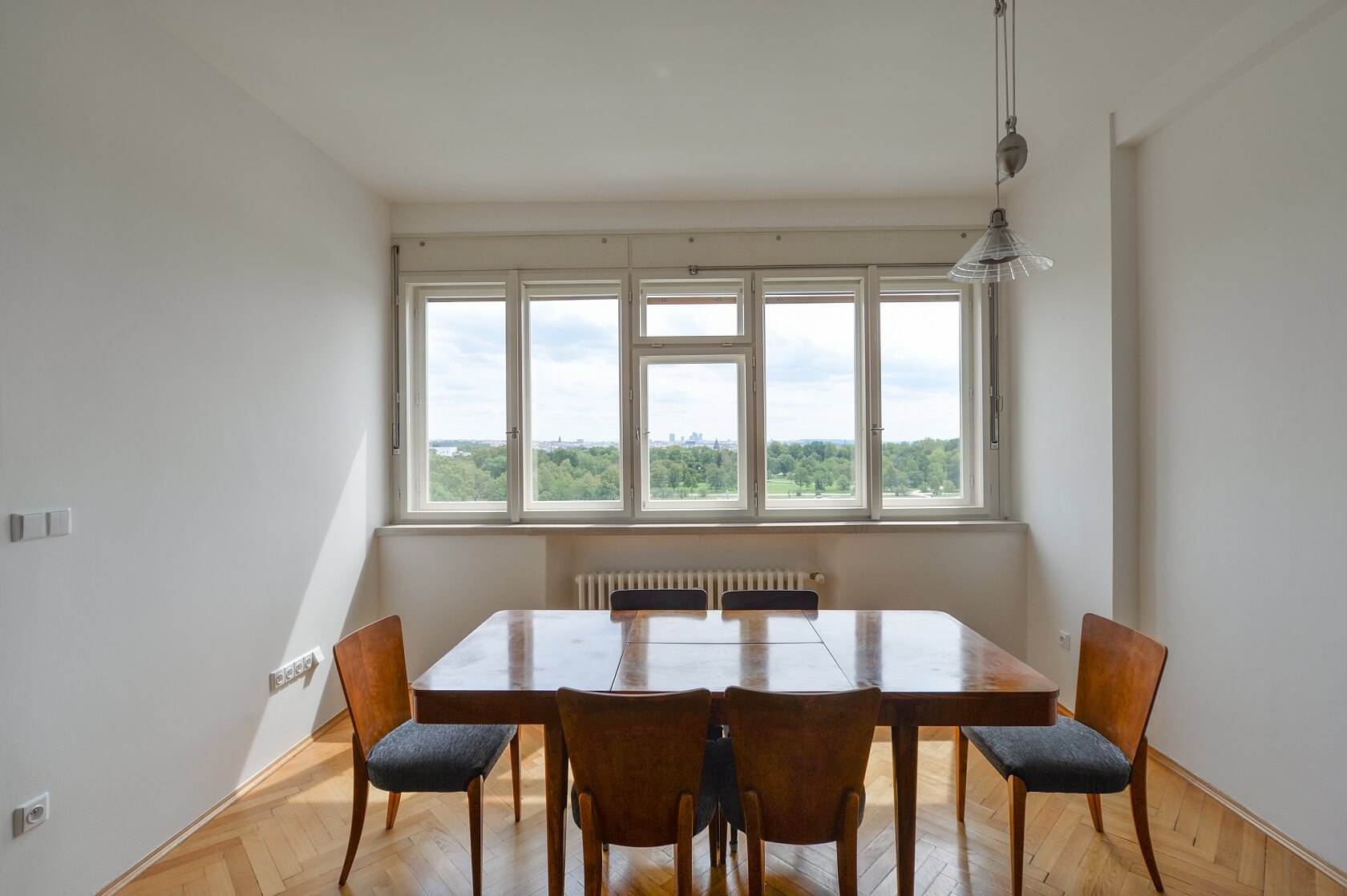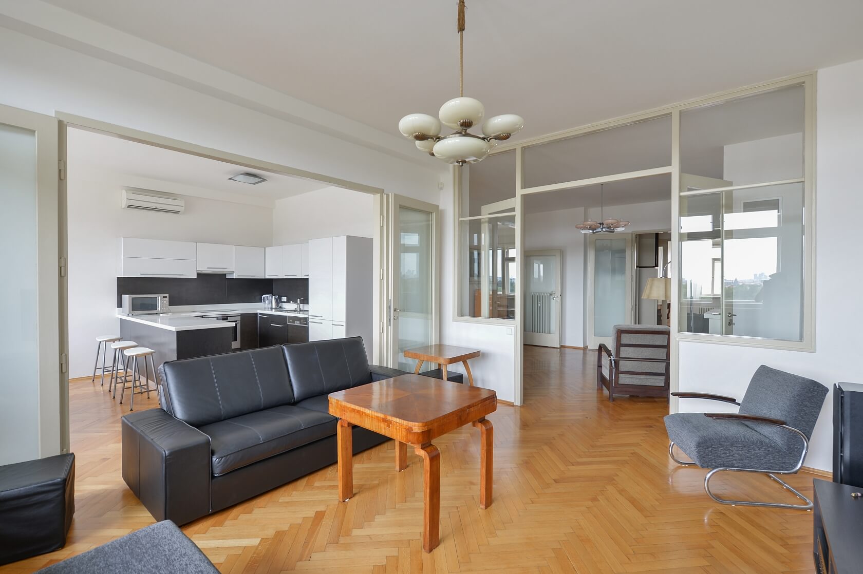 Klimatizovaný zařízený byt se 2 balkony, krbem a výhledem do přilehlých Letenských sadů, v 5. patře funkcionalistického činžovního domu s výtahem v Praze 7 – Bubenči, v pěším dosahu parku na Letné a Stromovky. Vyhledávaná rezidenční lokalita s bohatou občanskou vybaveností - kavárny, restaurace, bistra, obchody, kulturní zařízení ad., s velmi rychlou dostupností do centra, pouhou jednu zastávku tramvají od stanice metra Hradčanská. Rychlá dostupnost na letiště a do mezinárodních škol v Praze 6.