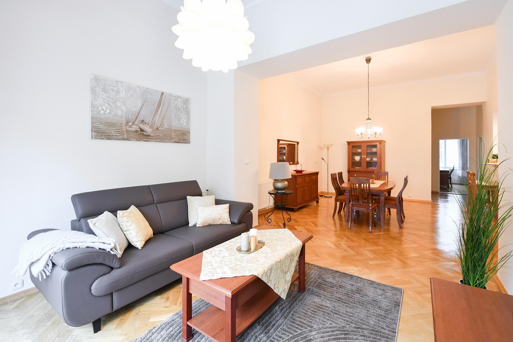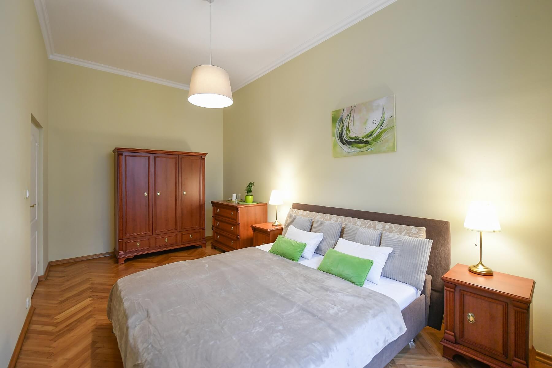 Klasický, plně zařízený byt v 1. patře kompletně zrekonstruovaného činžovního domu s výtahem a společnou zahradou, situovaný v klidné ulici na Vinohradech pouhé 2 minuty chůze od stanice metra Náměstí Míru. Lokalita známá širokým výběrem restaurací, kaváren a obchodů nabízí i relaxaci v nedalekých Havlíčkových nebo Riegrových sadech.