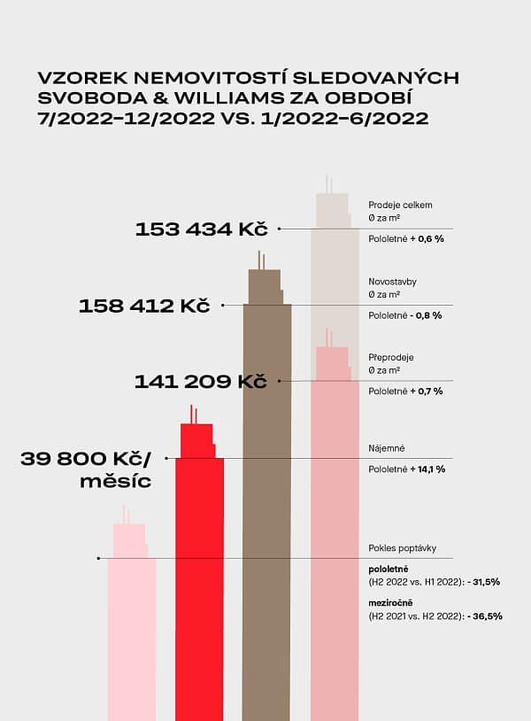 Ke čtvrtému kvartálu 2022 klienti Svoboda & Williams za metr čtvereční novostavby v průměru zaplatili 158 412 Kč a za metr čtvereční přeprodeje 141 209 Kč. Zatímco na Praze 1 průměrná cena metru čtverečního novostavby dosahovala 213 441 Kč, nejlevněji bylo možné pořídit novou nemovitost na Praze 9, v průměru za 119 981 Kč za čtvereční metr. „Poprvé v historii našich Market Reportů tvoří klienti, kteří si berou na koupi bytu hypotéku, méně než 35 % ze všech realizovaných transakcí,“ říká analytik Svoboda & Williams Kryštof Kušiak. Téměř 70 % českých kupujících, kteří nákup financují vlastními zdroji, poukazuje na velkou kupní sílu lokálních obyvatel, kterým kvalitní nemovitosti v době vysoké inflace slouží jako “Safe Haven” k uložení finančních prostředků.