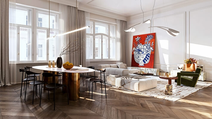 „Při rekonstrukci byl kladen důraz na obnovu historických prvků tak, aby si interiéry uchovaly svůj původní charakter a vytříbenou eleganci, typickou pro vinohradské domy,” popisuje charakter projektu Tomáš Blahuta, Senior Property Consultant Svoboda & Williams. Stropy vysoké až 4 m dodávají velkoryse řešeným místnostem vzdušnost, špaletová okna je zaplavují světlem, zatímco repliky původních dveří nebo dekorativní štuky propůjčí bydlení v Římské 34 noblesu života v belle epoque. „Součástí všech jednotek jsou jižně orientované lodžie s výhledem do klidného, zeleného vnitrobloku,” dodává Tomáš Blahuta.