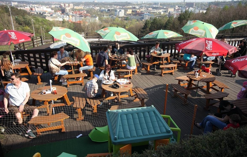 Nahoře na kopci areálu se nachází příjemná restaurace s výhledem na Prahu, která nabízí posezení uvnitř i venku a představuje ideální místo pro den strávený s rodinou, oslavu narozenin, firemní večírky a další akce.
